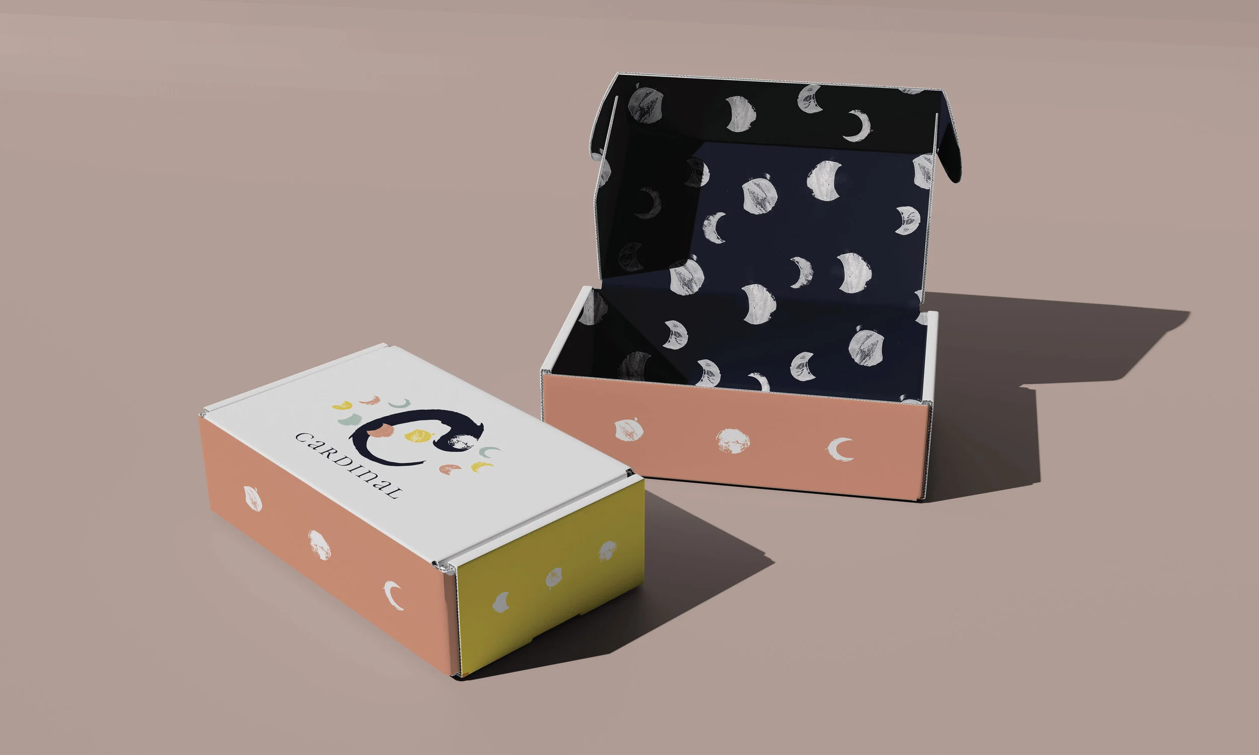 “CARDINAL” is a subscription box brand for tweens going through their first menstrual cycle. The goal of the project was to create a modern subscription box brand and brand guideline with a handmade and clean aesthetic. I created moon-cut stamps and brushed the logo’s iconic “C” with ink. The main goal of the Cardinal Brant was to be approachable and helpful. Light pinks, greens, and yellows quickly became the primary colors as they are fun, bright, and clean. Each box has helpful illustrated card with a QR code to learn how to use your products in a discrete and personal way.